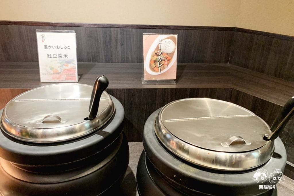甜湯頭:紅豆紫米;旁邊咖哩醬可直接淋在飯上面。