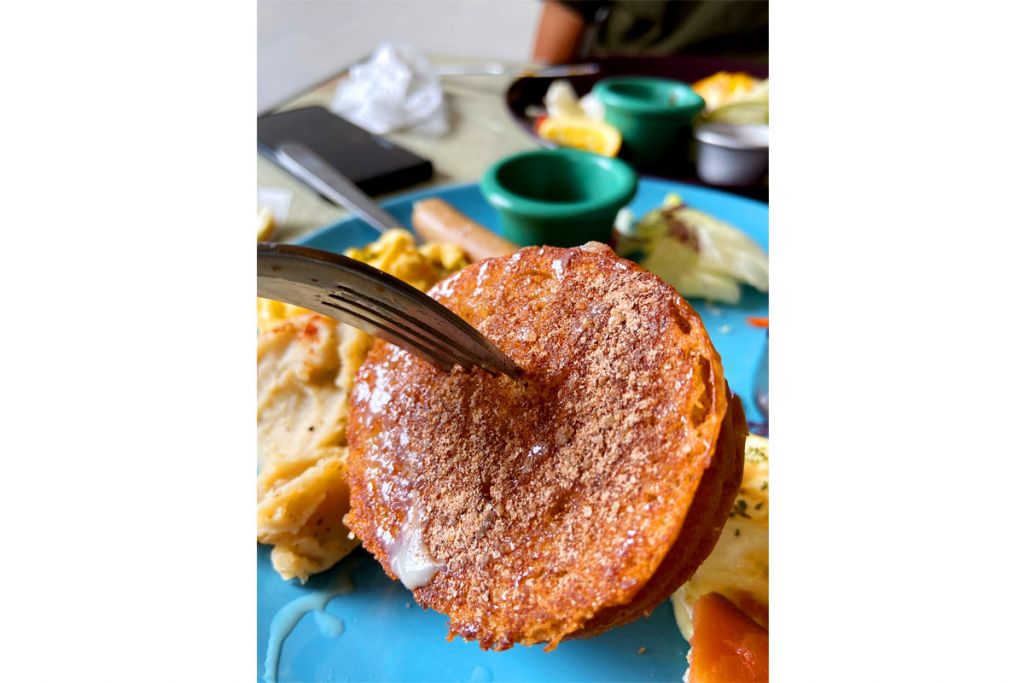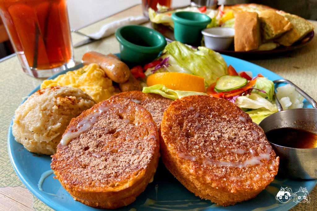 看那自家製的三個肉桂小圓土司+超大根德式早餐腸