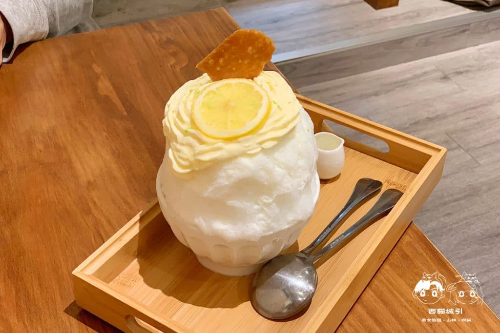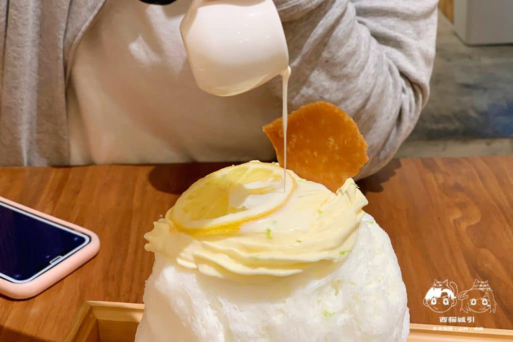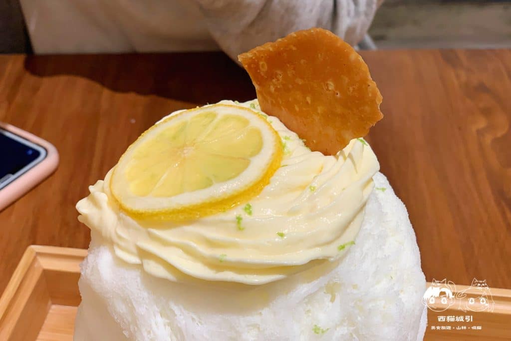 刨冰頂端淋上由萊姆以及青檸檬熬煮的法式檸檬醬,嚐了嚐卻不會感到過酸檸檬味,且多吃幾口更感受到高級感的微清甜,挖到刨冰內部還藏著大大塊的阿里山野生愛玉,整個大消暑!